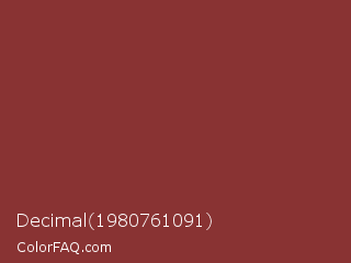 Decimal 1980761091 Color is a normal red color and the nearest color is Sanguine Brown #8d3d38. Hex code #893333 and RGB value is rgb(137,51,51). In RGB color space, this color is composed of 54% red, 20% green, 20% blue, In CMYK color space, this color is composed of 0% cyan, 63% magenta, 63% yellow , 46% black , In HSL color space, this color has a hue angle of 0° , 46% saturation and 37% lightness.