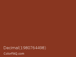 Decimal 1980764498 Color is a normal red color and the nearest color is Burnt Umber #8a3324. Hex code #893620 and RGB value is rgb(137,54,32). In RGB color space, this color is composed of 54% red, 21% green, 13% blue, In CMYK color space, this color is composed of 0% cyan, 61% magenta, 77% yellow , 46% black , In HSL color space, this color has a hue angle of 13° , 62% saturation and 33% lightness.