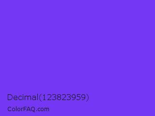 Decimal 123823959 Color is a normal indigo color and the nearest color is Blue Violet #8a2be2. Hex code #7438f5 and RGB value is rgb(116,56,245). In RGB color space, this color is composed of 45% red, 22% green, 96% blue, In CMYK color space, this color is composed of 53% cyan, 77% magenta, 0% yellow , 4% black , In HSL color space, this color has a hue angle of 259° , 90% saturation and 59% lightness.