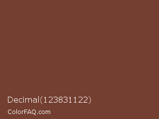 Decimal 123831122 Color is a normal red color and the nearest color is Old Copper #724a2f. Hex code #743f30 and RGB value is rgb(116,63,48). In RGB color space, this color is composed of 45% red, 25% green, 19% blue, In CMYK color space, this color is composed of 0% cyan, 46% magenta, 59% yellow , 55% black , In HSL color space, this color has a hue angle of 13° , 41% saturation and 32% lightness.