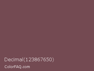 Decimal 123867650 Color is a normal red color and the nearest color is Ferra #704f50. Hex code #744a52 and RGB value is rgb(116,74,82). In RGB color space, this color is composed of 45% red, 29% green, 32% blue, In CMYK color space, this color is composed of 0% cyan, 36% magenta, 29% yellow , 55% black , In HSL color space, this color has a hue angle of 349° , 22% saturation and 37% lightness.