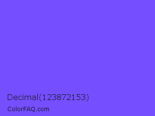 Decimal 123872153 Color is a light indigo color and the nearest color is Very Light Blue #6666ff. Hex code #744eff and RGB value is rgb(116,78,255). In RGB color space, this color is composed of 45% red, 31% green, 100% blue, In CMYK color space, this color is composed of 55% cyan, 69% magenta, 0% yellow , 0% black , In HSL color space, this color has a hue angle of 253° , 100% saturation and 65% lightness.