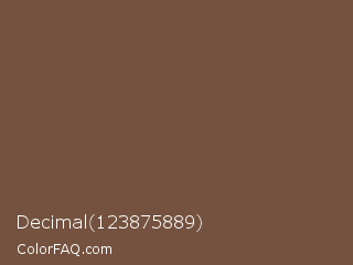 Decimal 123875889 Color is a normal orange color and the nearest color is Tuscan Brown Coffee #6f4e37. Hex code #74523f and RGB value is rgb(116,82,63). In RGB color space, this color is composed of 45% red, 32% green, 25% blue, In CMYK color space, this color is composed of 0% cyan, 29% magenta, 46% yellow , 55% black , In HSL color space, this color has a hue angle of 22° , 30% saturation and 35% lightness.