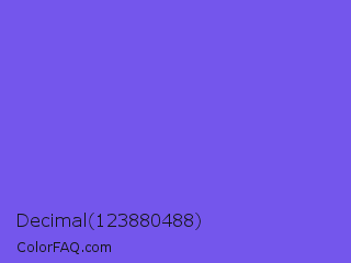 Decimal 123880488 Color is a light indigo color and the nearest color is Medium Slate Blue #7b68ee. Hex code #7456ec and RGB value is rgb(116,86,236). In RGB color space, this color is composed of 45% red, 34% green, 93% blue, In CMYK color space, this color is composed of 51% cyan, 64% magenta, 0% yellow , 7% black , In HSL color space, this color has a hue angle of 252° , 80% saturation and 63% lightness.