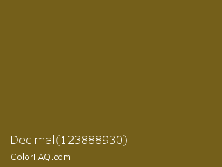 Decimal 123888930 Color is a dark yellow color and the nearest color is Himalaya #6a5d1b. Hex code #745f1a and RGB value is rgb(116,95,26). In RGB color space, this color is composed of 45% red, 37% green, 10% blue, In CMYK color space, this color is composed of 0% cyan, 18% magenta, 78% yellow , 55% black , In HSL color space, this color has a hue angle of 46° , 63% saturation and 28% lightness.