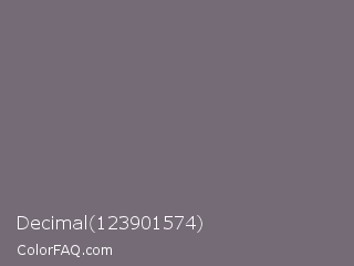 Decimal 123901574 Color is a normal purple color and the nearest color is Fedora #796a78. Hex code #746b76 and RGB value is rgb(116,107,118). In RGB color space, this color is composed of 45% red, 42% green, 46% blue, In CMYK color space, this color is composed of 2% cyan, 9% magenta, 0% yellow , 54% black , In HSL color space, this color has a hue angle of 289° , 5% saturation and 44% lightness.