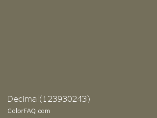Decimal 123930243 Color is a normal yellow color and the nearest color is Crocodile #736d58. Hex code #746f5b and RGB value is rgb(116,111,91). In RGB color space, this color is composed of 45% red, 44% green, 36% blue, In CMYK color space, this color is composed of 0% cyan, 4% magenta, 22% yellow , 55% black , In HSL color space, this color has a hue angle of 48° , 12% saturation and 41% lightness.