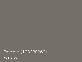 Decimal 123930262 Color is a normal orange color and the nearest color is Pablo #776f61. Hex code #746f68 and RGB value is rgb(116,111,104). In RGB color space, this color is composed of 45% red, 44% green, 41% blue, In CMYK color space, this color is composed of 0% cyan, 4% magenta, 10% yellow , 55% black , In HSL color space, this color has a hue angle of 35° , 5% saturation and 43% lightness.