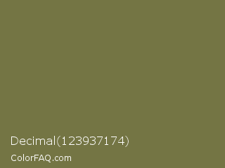 Decimal 123937174 Color is a normal yellow color and the nearest color is Go Ben #726d4e. Hex code #747544 and RGB value is rgb(116,117,68). In RGB color space, this color is composed of 45% red, 46% green, 27% blue, In CMYK color space, this color is composed of 1% cyan, 0% magenta, 42% yellow , 54% black , In HSL color space, this color has a hue angle of 61° , 26% saturation and 36% lightness.