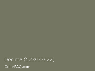 Decimal 123937922 Color is a normal yellow color and the nearest color is Limed Ash #747d63. Hex code #747662 and RGB value is rgb(116,118,98). In RGB color space, this color is composed of 45% red, 46% green, 38% blue, In CMYK color space, this color is composed of 2% cyan, 0% magenta, 17% yellow , 54% black , In HSL color space, this color has a hue angle of 66° , 9% saturation and 42% lightness.