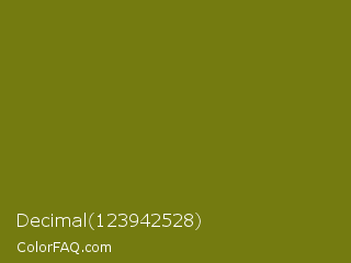 Decimal 123942528 Color is a dark yellow color and the nearest color is Olivetone #716e10. Hex code #747b10 and RGB value is rgb(116,123,16). In RGB color space, this color is composed of 45% red, 48% green, 6% blue, In CMYK color space, this color is composed of 6% cyan, 0% magenta, 87% yellow , 52% black , In HSL color space, this color has a hue angle of 64° , 77% saturation and 27% lightness.
