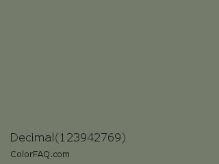Decimal 123942769 Color is a normal green color and the nearest color is Limed Ash #747d63. Hex code #747b6b and RGB value is rgb(116,123,107). In RGB color space, this color is composed of 45% red, 48% green, 42% blue, In CMYK color space, this color is composed of 6% cyan, 0% magenta, 13% yellow , 52% black , In HSL color space, this color has a hue angle of 86° , 7% saturation and 45% lightness.