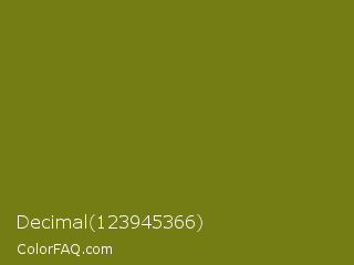 Decimal 123945366 Color is a dark yellow color and the nearest color is Pacifika #778120. Hex code #747d14 and RGB value is rgb(116,125,20). In RGB color space, this color is composed of 45% red, 49% green, 8% blue, In CMYK color space, this color is composed of 7% cyan, 0% magenta, 84% yellow , 51% black , In HSL color space, this color has a hue angle of 65° , 72% saturation and 28% lightness.