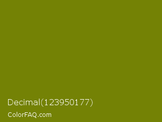 Decimal 123950177 Color is a dark yellow color and the nearest color is Olive #808000. Hex code #748205 and RGB value is rgb(116,130,5). In RGB color space, this color is composed of 45% red, 51% green, 2% blue, In CMYK color space, this color is composed of 11% cyan, 0% magenta, 96% yellow , 49% black , In HSL color space, this color has a hue angle of 67° , 93% saturation and 26% lightness.