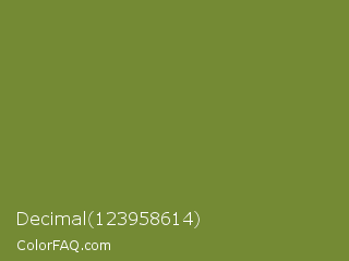 Decimal 123958614 Color is a normal lime color and the nearest color is Wasabi #788a25. Hex code #748a34 and RGB value is rgb(116,138,52). In RGB color space, this color is composed of 45% red, 54% green, 20% blue, In CMYK color space, this color is composed of 16% cyan, 0% magenta, 62% yellow , 46% black , In HSL color space, this color has a hue angle of 75° , 45% saturation and 37% lightness.