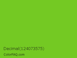 Decimal 124073575 Color is a normal green color and the nearest color is Lima #76bd17. Hex code #74c923 and RGB value is rgb(116,201,35). In RGB color space, this color is composed of 45% red, 79% green, 14% blue, In CMYK color space, this color is composed of 42% cyan, 0% magenta, 83% yellow , 21% black , In HSL color space, this color has a hue angle of 91° , 70% saturation and 46% lightness.