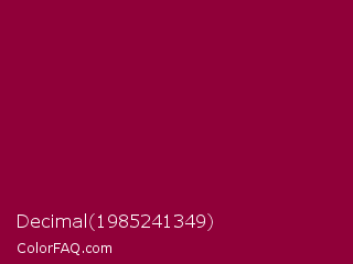 Decimal 1985241349 Color is a dark rose color and the nearest color is Pink Raspberry #980036. Hex code #900039 and RGB value is rgb(144,0,57). In RGB color space, this color is composed of 56% red, 0% green, 22% blue, In CMYK color space, this color is composed of 0% cyan, 100% magenta, 60% yellow , 44% black , In HSL color space, this color has a hue angle of 336° , 100% saturation and 28% lightness.