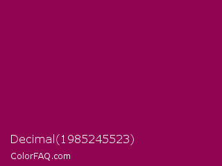 Decimal 1985245523 Color is a dark magenta color and the nearest color is Cardinal Pink #8c055e. Hex code #900451 and RGB value is rgb(144,4,81). In RGB color space, this color is composed of 56% red, 2% green, 32% blue, In CMYK color space, this color is composed of 0% cyan, 97% magenta, 44% yellow , 44% black , In HSL color space, this color has a hue angle of 327° , 95% saturation and 29% lightness.