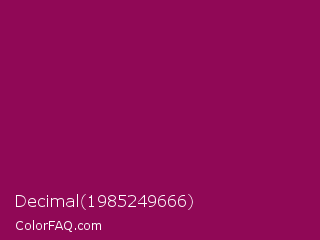 Decimal 1985249666 Color is a dark magenta color and the nearest color is Cardinal Pink #8c055e. Hex code #900856 and RGB value is rgb(144,8,86). In RGB color space, this color is composed of 56% red, 3% green, 34% blue, In CMYK color space, this color is composed of 0% cyan, 94% magenta, 40% yellow , 44% black , In HSL color space, this color has a hue angle of 326° , 89% saturation and 30% lightness.
