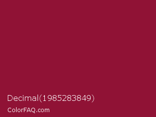 Decimal 1985283849 Color is a normal rose color and the nearest color is Antique Ruby #841b2d. Hex code #901235 and RGB value is rgb(144,18,53). In RGB color space, this color is composed of 56% red, 7% green, 21% blue, In CMYK color space, this color is composed of 0% cyan, 88% magenta, 63% yellow , 44% black , In HSL color space, this color has a hue angle of 343° , 78% saturation and 32% lightness.