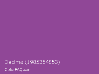 Decimal 1985364853 Color is a normal magenta color and the nearest color is Plum #8e4585. Hex code #904797 and RGB value is rgb(144,71,151). In RGB color space, this color is composed of 56% red, 28% green, 59% blue, In CMYK color space, this color is composed of 5% cyan, 53% magenta, 0% yellow , 41% black , In HSL color space, this color has a hue angle of 295° , 36% saturation and 44% lightness.