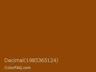 Decimal 1985365124 Color is a dark orange color and the nearest color is Brown #964b00. Hex code #904804 and RGB value is rgb(144,72,4). In RGB color space, this color is composed of 56% red, 28% green, 2% blue, In CMYK color space, this color is composed of 0% cyan, 50% magenta, 97% yellow , 44% black , In HSL color space, this color has a hue angle of 29° , 95% saturation and 29% lightness.