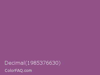 Decimal 1985376630 Color is a normal magenta color and the nearest color is Razzmic Berry #8d4e85. Hex code #905288 and RGB value is rgb(144,82,136). In RGB color space, this color is composed of 56% red, 32% green, 53% blue, In CMYK color space, this color is composed of 0% cyan, 43% magenta, 6% yellow , 44% black , In HSL color space, this color has a hue angle of 308° , 27% saturation and 44% lightness.