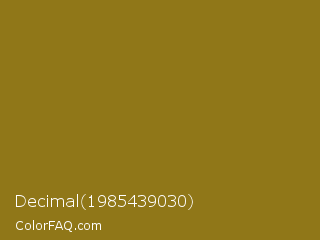 Decimal 1985439030 Color is a normal yellow color and the nearest color is Sand Dune #967117. Hex code #907718 and RGB value is rgb(144,119,24). In RGB color space, this color is composed of 56% red, 47% green, 9% blue, In CMYK color space, this color is composed of 0% cyan, 17% magenta, 83% yellow , 44% black , In HSL color space, this color has a hue angle of 48° , 71% saturation and 33% lightness.