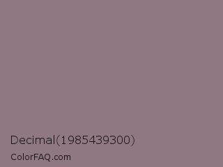 Decimal 1985439300 Color is a normal rose color and the nearest color is Rocket Metallic #8a7f80. Hex code #907784 and RGB value is rgb(144,119,132). In RGB color space, this color is composed of 56% red, 47% green, 52% blue, In CMYK color space, this color is composed of 0% cyan, 17% magenta, 8% yellow , 44% black , In HSL color space, this color has a hue angle of 329° , 10% saturation and 52% lightness.