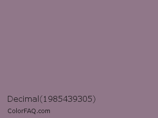 Decimal 1985439305 Color is a normal magenta color and the nearest color is Mountbatten Pink #997a8d. Hex code #907789 and RGB value is rgb(144,119,137). In RGB color space, this color is composed of 56% red, 47% green, 54% blue, In CMYK color space, this color is composed of 0% cyan, 17% magenta, 5% yellow , 44% black , In HSL color space, this color has a hue angle of 317° , 10% saturation and 52% lightness.