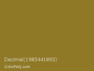 Decimal 1985441893 Color is a normal yellow color and the nearest color is Old Moss Green #867e36. Hex code #907929 and RGB value is rgb(144,121,41). In RGB color space, this color is composed of 56% red, 47% green, 16% blue, In CMYK color space, this color is composed of 0% cyan, 16% magenta, 72% yellow , 44% black , In HSL color space, this color has a hue angle of 47° , 56% saturation and 36% lightness.