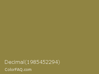 Decimal 1985452294 Color is a normal yellow color and the nearest color is Sycamore #908d39. Hex code #908442 and RGB value is rgb(144,132,66). In RGB color space, this color is composed of 56% red, 52% green, 26% blue, In CMYK color space, this color is composed of 0% cyan, 8% magenta, 54% yellow , 44% black , In HSL color space, this color has a hue angle of 51° , 37% saturation and 41% lightness.
