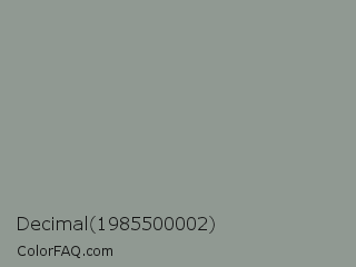 Decimal 1985500002 Color is a normal green color and the nearest color is Mantle #8b9c90. Hex code #909992 and RGB value is rgb(144,153,146). In RGB color space, this color is composed of 56% red, 60% green, 57% blue, In CMYK color space, this color is composed of 6% cyan, 0% magenta, 5% yellow , 40% black , In HSL color space, this color has a hue angle of 133° , 4% saturation and 58% lightness.