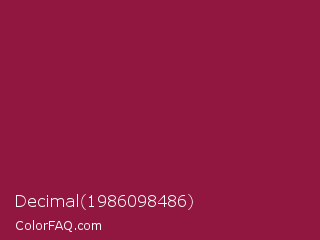Decimal 1986098486 Color is a normal rose color and the nearest color is Big Dip O Ruby #9c2542. Hex code #911740 and RGB value is rgb(145,23,64). In RGB color space, this color is composed of 57% red, 9% green, 25% blue, In CMYK color space, this color is composed of 0% cyan, 84% magenta, 56% yellow , 43% black , In HSL color space, this color has a hue angle of 340° , 73% saturation and 33% lightness.
