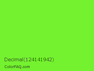 Decimal 124141942 Color is a normal green color and the nearest color is Spring Frost #87ff2a. Hex code #74f230 and RGB value is rgb(116,242,48). In RGB color space, this color is composed of 45% red, 95% green, 19% blue, In CMYK color space, this color is composed of 52% cyan, 0% magenta, 80% yellow , 5% black , In HSL color space, this color has a hue angle of 99° , 88% saturation and 57% lightness.