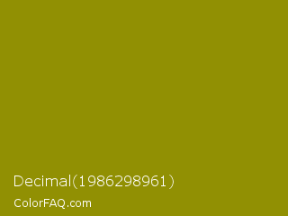 Decimal 1986298961 Color is a dark yellow color and the nearest color is Dark Yellow #9b870c. Hex code #919003 and RGB value is rgb(145,144,3). In RGB color space, this color is composed of 57% red, 56% green, 1% blue, In CMYK color space, this color is composed of 0% cyan, 1% magenta, 98% yellow , 43% black , In HSL color space, this color has a hue angle of 60° , 96% saturation and 29% lightness.