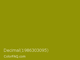 Decimal 1986303095 Color is a dark yellow color and the nearest color is Dark Yellow #9b870c. Hex code #919405 and RGB value is rgb(145,148,5). In RGB color space, this color is composed of 57% red, 58% green, 2% blue, In CMYK color space, this color is composed of 2% cyan, 0% magenta, 97% yellow , 42% black , In HSL color space, this color has a hue angle of 61° , 93% saturation and 30% lightness.