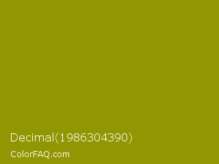 Decimal 1986304390 Color is a dark yellow color and the nearest color is Dark Yellow #9b870c. Hex code #919602 and RGB value is rgb(145,150,2). In RGB color space, this color is composed of 57% red, 59% green, 1% blue, In CMYK color space, this color is composed of 3% cyan, 0% magenta, 99% yellow , 41% black , In HSL color space, this color has a hue angle of 62° , 97% saturation and 30% lightness.