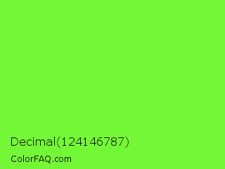 Decimal 124146787 Color is a normal green color and the nearest color is Spring Frost #87ff2a. Hex code #74f737 and RGB value is rgb(116,247,55). In RGB color space, this color is composed of 45% red, 97% green, 22% blue, In CMYK color space, this color is composed of 53% cyan, 0% magenta, 78% yellow , 3% black , In HSL color space, this color has a hue angle of 101° , 92% saturation and 59% lightness.