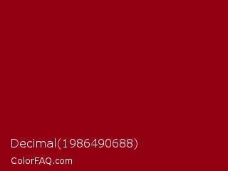 Decimal 1986490688 Color is a dark red color and the nearest color is Scarlett #950015. Hex code #920014 and RGB value is rgb(146,0,20). In RGB color space, this color is composed of 57% red, 0% green, 8% blue, In CMYK color space, this color is composed of 0% cyan, 100% magenta, 86% yellow , 43% black , In HSL color space, this color has a hue angle of 352° , 100% saturation and 29% lightness.