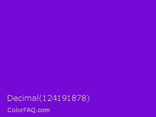 Decimal 124191878 Color is a normal purple color and the nearest color is French Violet #8806ce. Hex code #750ad6 and RGB value is rgb(117,10,214). In RGB color space, this color is composed of 46% red, 4% green, 84% blue, In CMYK color space, this color is composed of 45% cyan, 95% magenta, 0% yellow , 16% black , In HSL color space, this color has a hue angle of 271° , 91% saturation and 44% lightness.