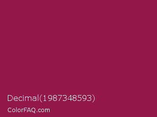 Decimal 1987348593 Color is a normal rose color and the nearest color is Disco #871550. Hex code #931847 and RGB value is rgb(147,24,71). In RGB color space, this color is composed of 58% red, 9% green, 28% blue, In CMYK color space, this color is composed of 0% cyan, 84% magenta, 52% yellow , 42% black , In HSL color space, this color has a hue angle of 337° , 72% saturation and 34% lightness.