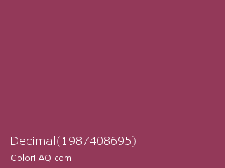 Decimal 1987408695 Color is a normal rose color and the nearest color is Quinacridone Magenta #8e3a59. Hex code #933959 and RGB value is rgb(147,57,89). In RGB color space, this color is composed of 58% red, 22% green, 35% blue, In CMYK color space, this color is composed of 0% cyan, 61% magenta, 39% yellow , 42% black , In HSL color space, this color has a hue angle of 339° , 44% saturation and 40% lightness.