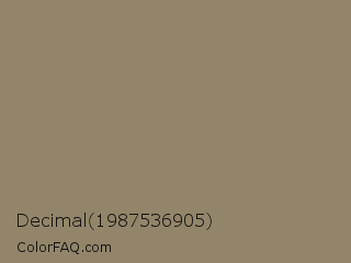Decimal 1987536905 Color is a normal orange color and the nearest color is Arrowtown #948771. Hex code #938569 and RGB value is rgb(147,133,105). In RGB color space, this color is composed of 58% red, 52% green, 41% blue, In CMYK color space, this color is composed of 0% cyan, 10% magenta, 29% yellow , 42% black , In HSL color space, this color has a hue angle of 40° , 17% saturation and 49% lightness.