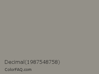 Decimal 1987548758 Color is a normal orange color and the nearest color is Stack #8a8f8a. Hex code #939088 and RGB value is rgb(147,144,136). In RGB color space, this color is composed of 58% red, 56% green, 53% blue, In CMYK color space, this color is composed of 0% cyan, 2% magenta, 7% yellow , 42% black , In HSL color space, this color has a hue angle of 44° , 5% saturation and 55% lightness.
