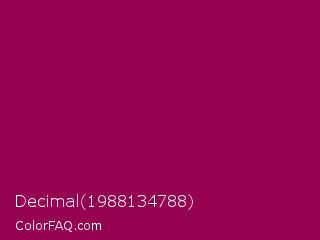 Decimal 1988134788 Color is a dark rose color and the nearest color is Cardinal Pink #8c055e. Hex code #940250 and RGB value is rgb(148,2,80). In RGB color space, this color is composed of 58% red, 1% green, 31% blue, In CMYK color space, this color is composed of 0% cyan, 99% magenta, 46% yellow , 42% black , In HSL color space, this color has a hue angle of 328° , 97% saturation and 29% lightness.