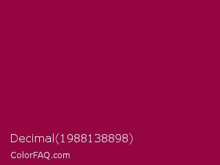 Decimal 1988138898 Color is a dark rose color and the nearest color is Pink Raspberry #980036. Hex code #940640 and RGB value is rgb(148,6,64). In RGB color space, this color is composed of 58% red, 2% green, 25% blue, In CMYK color space, this color is composed of 0% cyan, 96% magenta, 57% yellow , 42% black , In HSL color space, this color has a hue angle of 335° , 92% saturation and 30% lightness.
