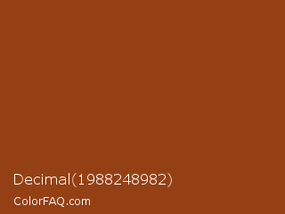 Decimal 1988248982 Color is a normal orange color and the nearest color is Saddle Brown #8b4513. Hex code #944014 and RGB value is rgb(148,64,20). In RGB color space, this color is composed of 58% red, 25% green, 8% blue, In CMYK color space, this color is composed of 0% cyan, 57% magenta, 86% yellow , 42% black , In HSL color space, this color has a hue angle of 21° , 76% saturation and 33% lightness.