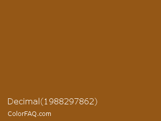 Decimal 1988297862 Color is a normal orange color and the nearest color is Hawaiian Tan #9d5616. Hex code #945716 and RGB value is rgb(148,87,22). In RGB color space, this color is composed of 58% red, 34% green, 9% blue, In CMYK color space, this color is composed of 0% cyan, 41% magenta, 85% yellow , 42% black , In HSL color space, this color has a hue angle of 31° , 74% saturation and 33% lightness.