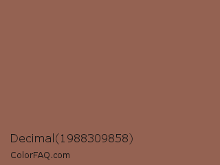 Decimal 1988309858 Color is a normal color and the nearest color is Spicy Mix #8b5f4d. Hex code #946252 and RGB value is rgb(148,98,82). In RGB color space, this color is composed of 58% red, 38% green, 32% blue, In CMYK color space, this color is composed of 0% cyan, 34% magenta, 45% yellow , 42% black , In HSL color space, this color has a hue angle of 15° , 29% saturation and 45% lightness.